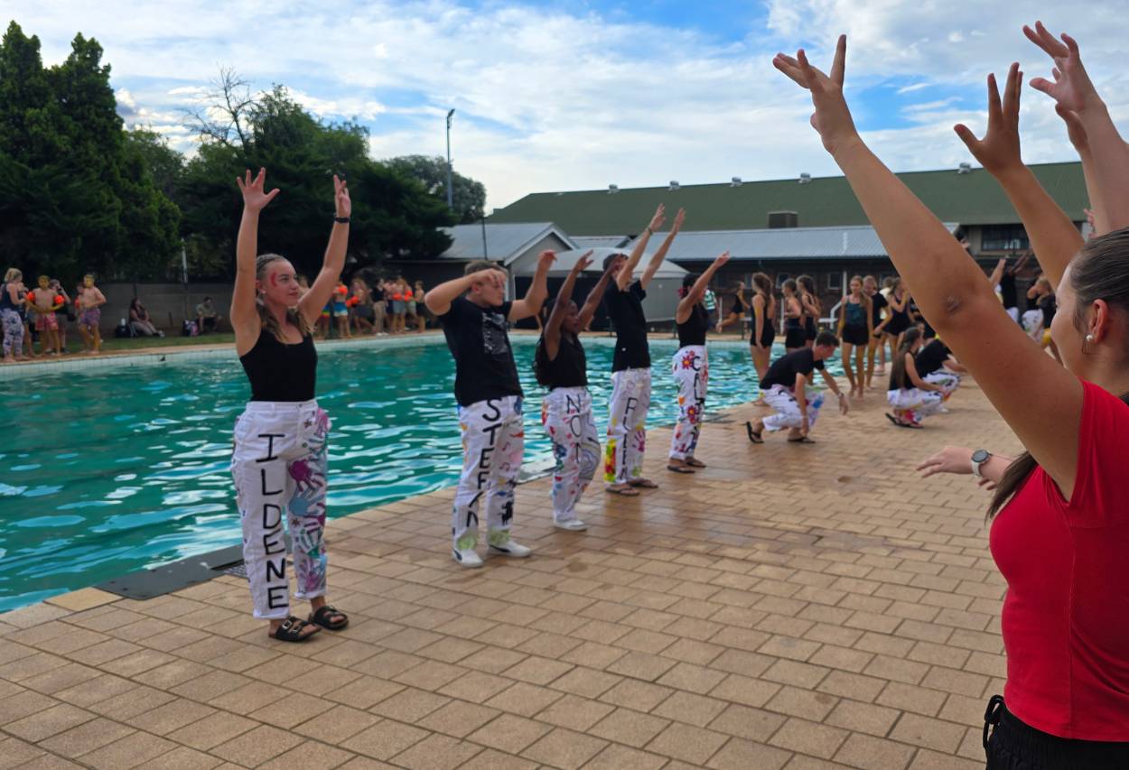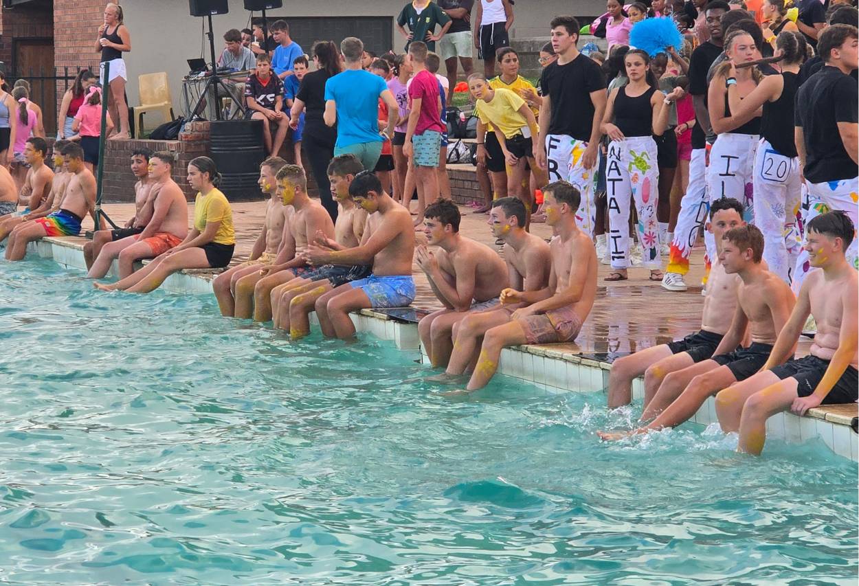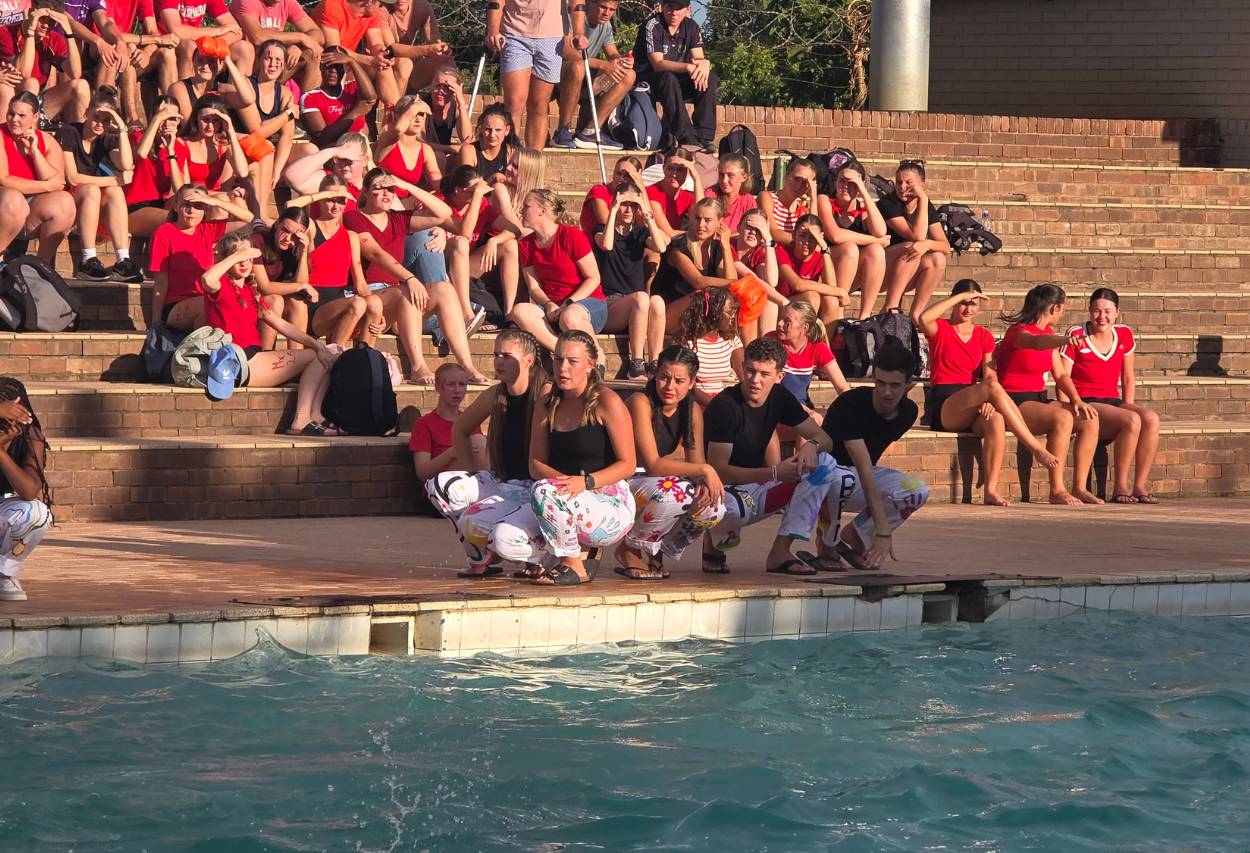 Die atmosfeer langs die swembad was elektries. Van die eerste item af het leerders met groot entoesiasme deelgeneem en hul beste gegee. Klasse het mekaar luidkeels aangemoedig en ‘n vreugdevolle gejuig het deur die lug weerklink. Die gees van samewerking en trots in die skool was duidelik sigbaar, en elke span het alles ingesit om hul klas trots te maak.